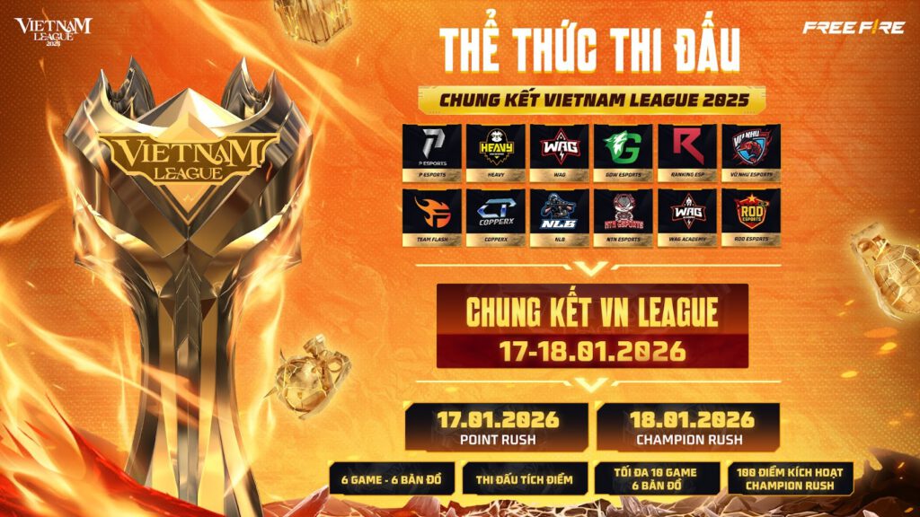Trở lại sau nhiều năm, VIETNAM LEAGUE 2025 là nơi quy tụ các đội tuyển Free Fire mạnh nhất Việt Nam. Sau giai đoạn vòng bảng diễn ra từ ngày 2/1 đến 4/1, 12 đội tuyển xuất sắc nhất sẽ cùng tranh tài ở Chung kết để tìm ra đội tuyển Free Fire mạnh nhất Việt Nam ở thời điểm hiện tại.