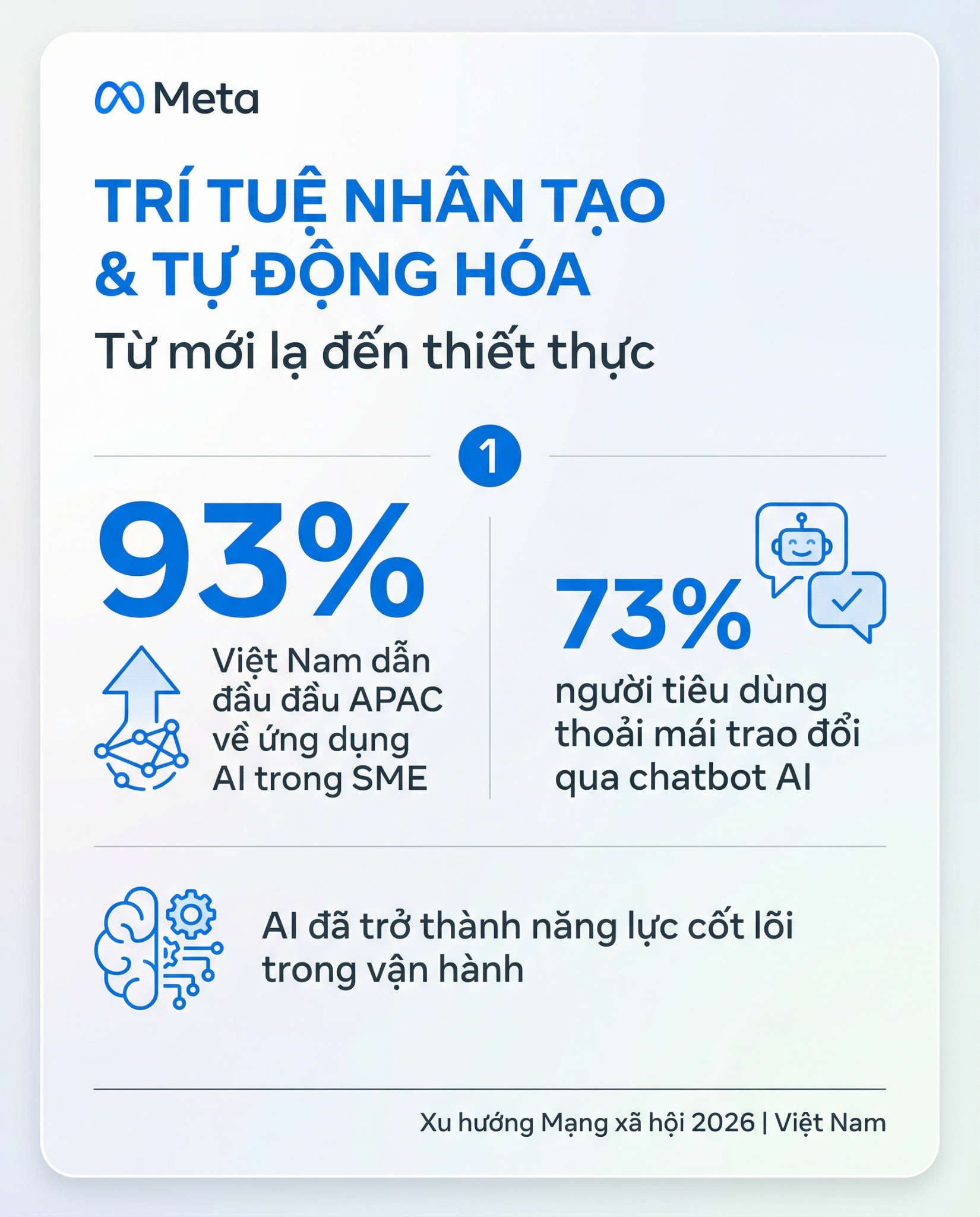 Gợi ý cho doanh nghiệp: Đầu tư vào các công cụ AI để nâng cao khả năng nhắm mục tiêu tới tệp khách hàng tiềm năng, cá nhân hóa gợi ý và tinh gọn hành trình mua sắm. Tận dụng các giải pháp AI và tự động hóa của Meta để tối ưu hiệu suất chiến dịch và gia tăng ROAS.