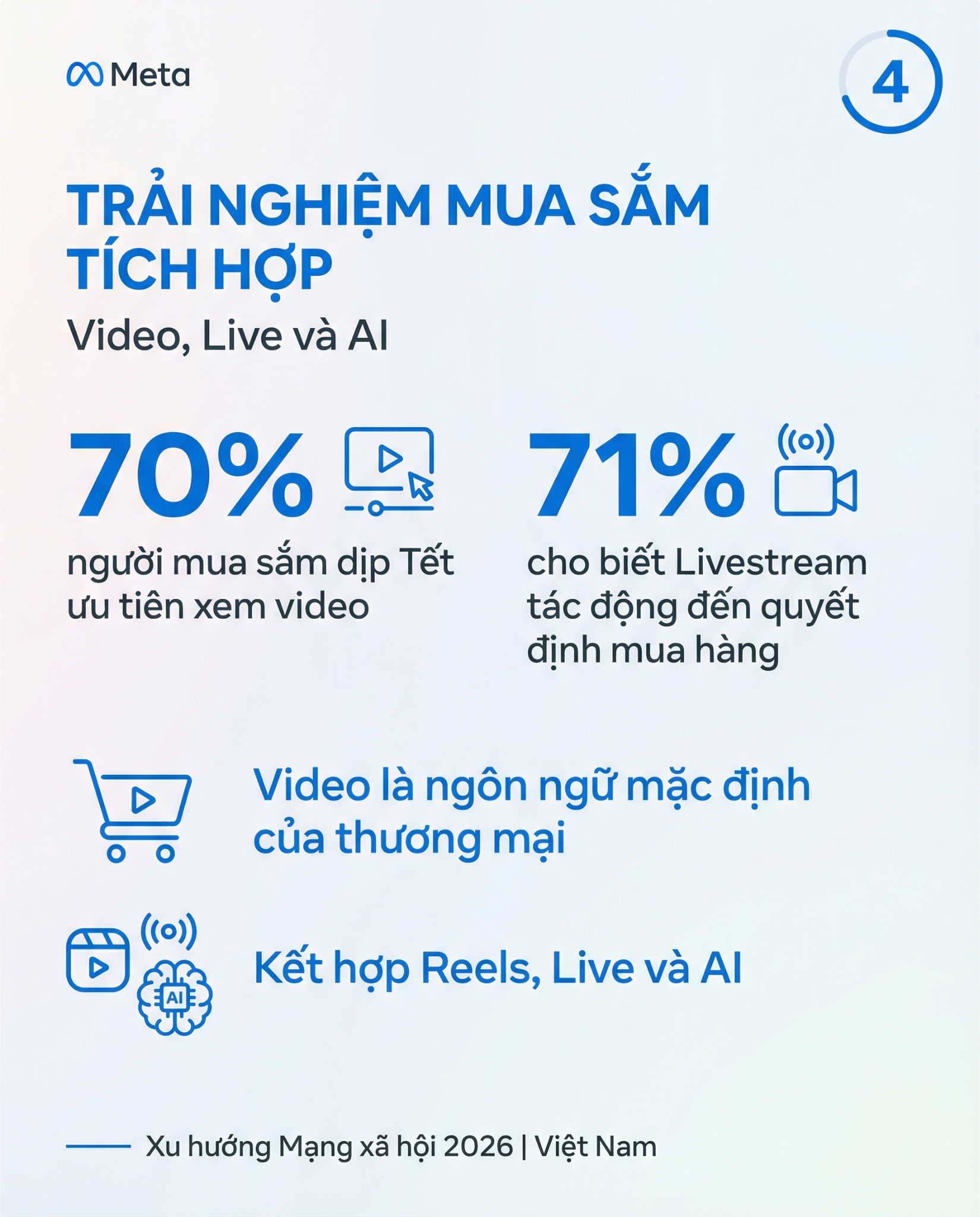 Video ngắn, đặc biệt là Reels, đóng vai trò quan trọng ở giai đoạn nhận biết và cân nhắc, với 70% người mua sắm dịp Tết ưu tiên xem video để tìm hiểu về sản phẩm. Livestream bán hàng cũng cho thấy sức ảnh hưởng mạnh mẽ trong những thời điểm cao điểm như Tết, với 71% người mua sắm cho biết hình thức này tác động đến quyết định mua hàng. Dựa trên sức ảnh hưởng của kênh thương mại này với quyết định mua hàng của người tiêu dùng, livestream ngày càng được kết hợp chặt chẽ với video và các công cụ AI để rút ngắn hành trình mua sắm, đưa người tiêu dùng từ khám phá đến mua hàng chỉ trong một phiên tương tác.