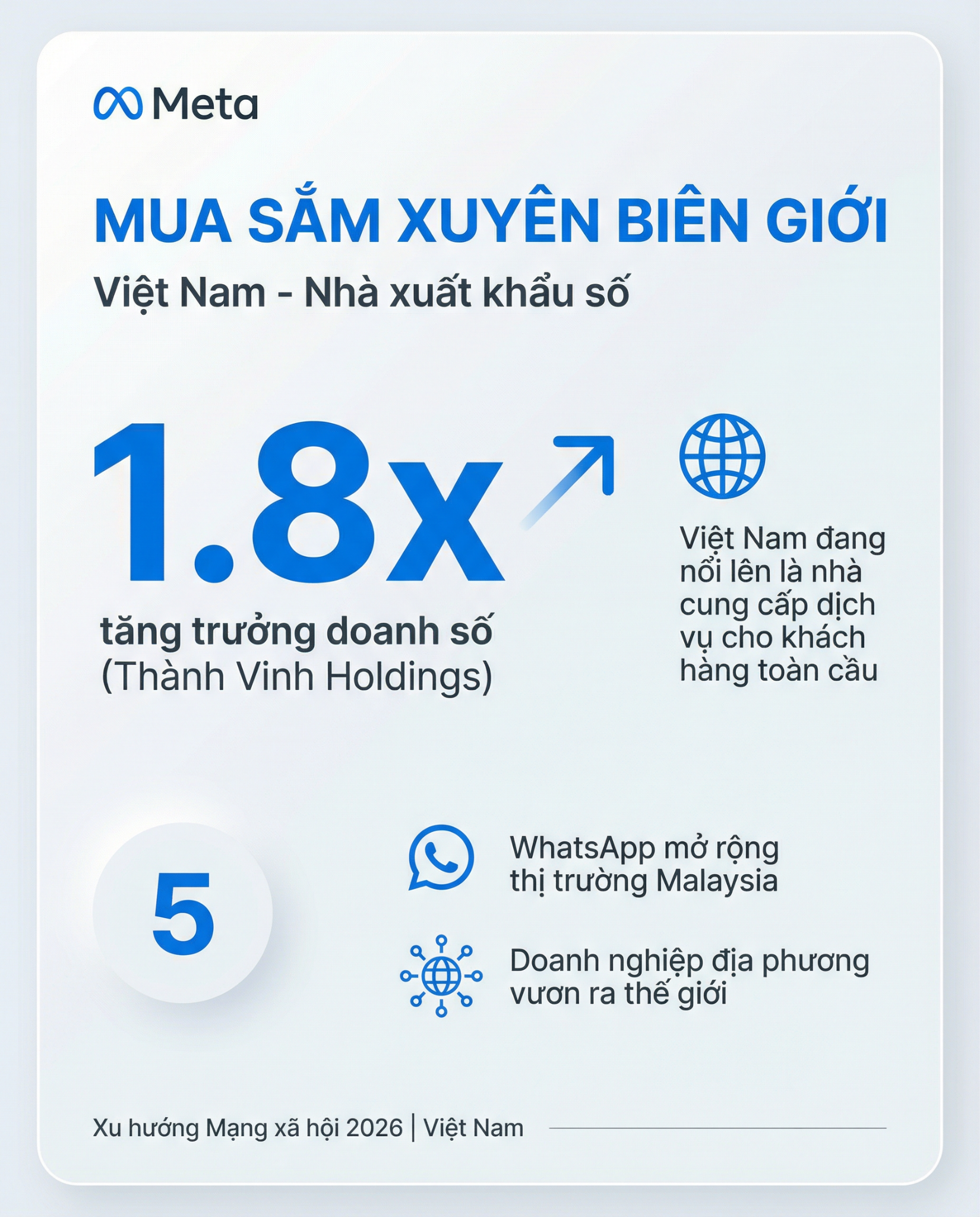 WhatsApp đóng vai trò quan trọng trong việc thúc đẩy thương mại xuyên biên giới. Với hơn 3 tỷ người dùng trên toàn cầu, WhatsApp cho phép doanh nghiệp Việt Nam kết nối liền mạch với khách hàng, nhà phân phối và đối tác quốc tế.