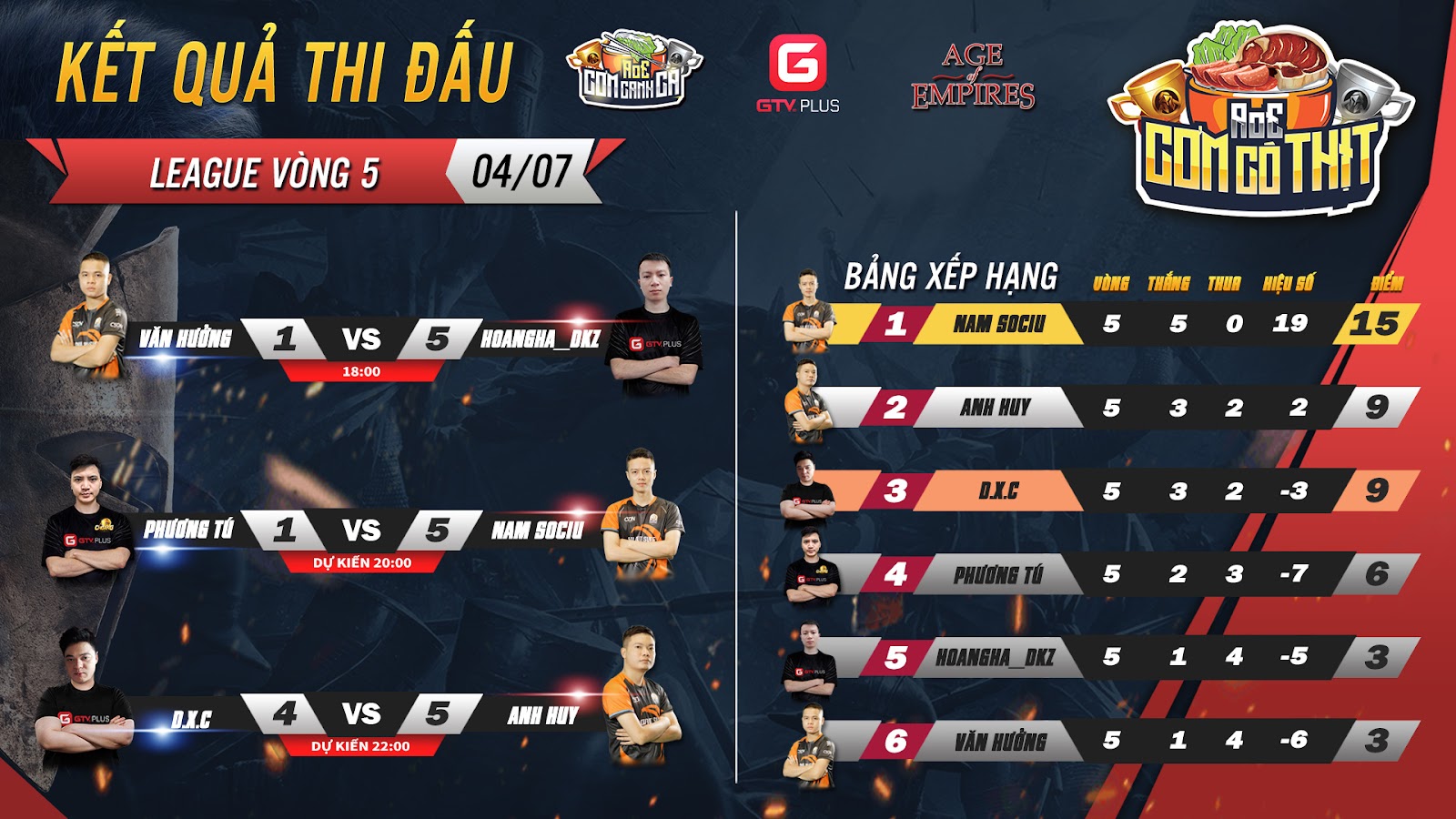 Vòng 5, vòng đấu cuối cùng của chặng League đã chứng kiến cuộc lật đổ ngoạn mục của HoangHa_dkz trước Văn Hưởng trong trận đấu quyết định đối với cả 2. HoangHa_dkz đã vượt qua Văn Hưởng với tỉ số 5-1 và xếp trên với hiệu số cách biệt 1 trận qua đó chính thức đẩy Văn Hưởng xuống chơi ở giải đấu AoE Cơm Canh Cà.