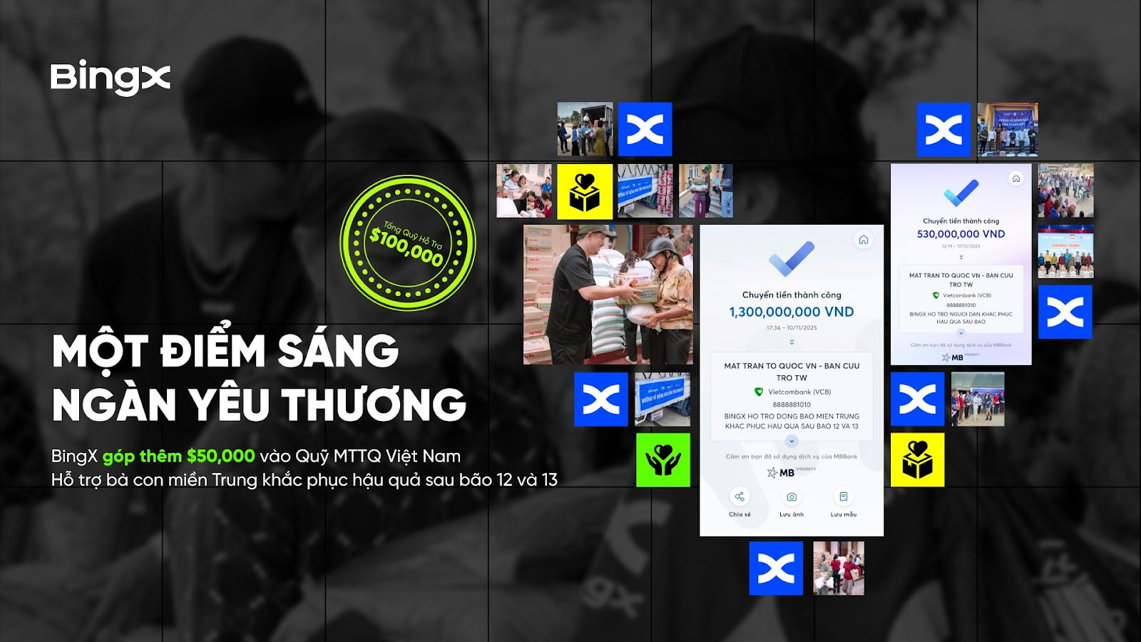 Ngày 11/11/2025 – BingX Charity, quỹ thiện nguyện trực thuộc BingX Global – nền tảng giao dịch tài sản kỹ thuật số và công ty Web3 AI hàng đầu – công bố đóng góp thêm 50,000 USD, nâng tổng quỹ cứu trợ bão lũ tại Việt Nam lên 2,6 tỷ đồng (100,000 USD).