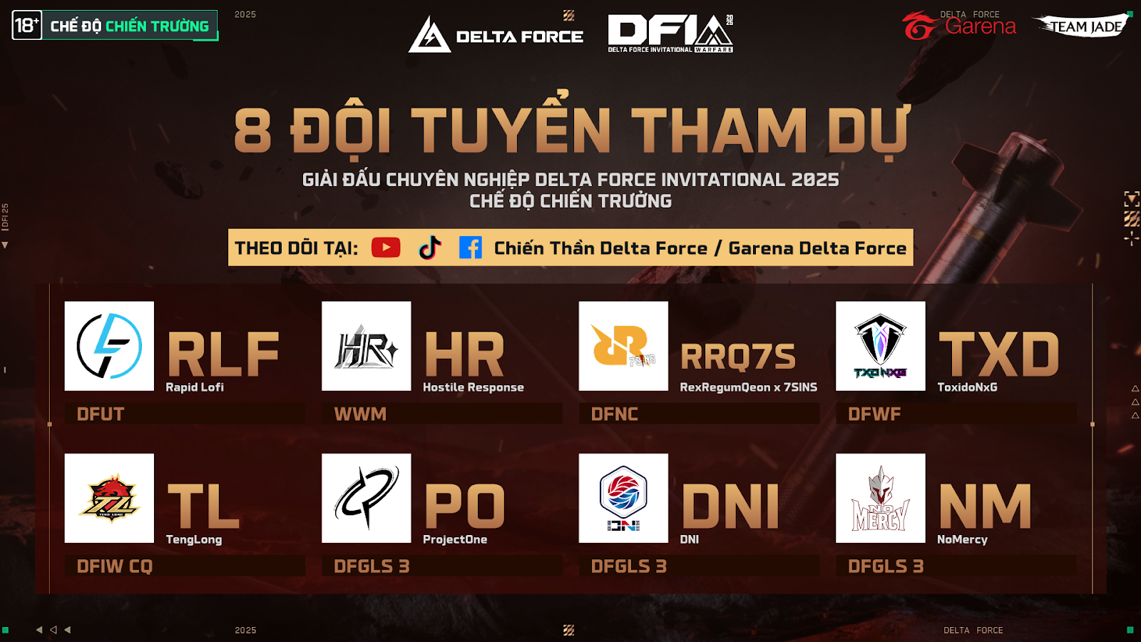 DFIW 2025 quy tụ 8 đội tuyển mạnh nhất từ các giải đấu khu vực và các vòng tuyển chọn. Bên cạnh đương kim vô địch Delta Force Ultimate Tournament 2025: Warfare – Rapid Lofi, 7 cái tên sẽ cùng tranh tài cho ngôi vị cao nhất bao gồm: