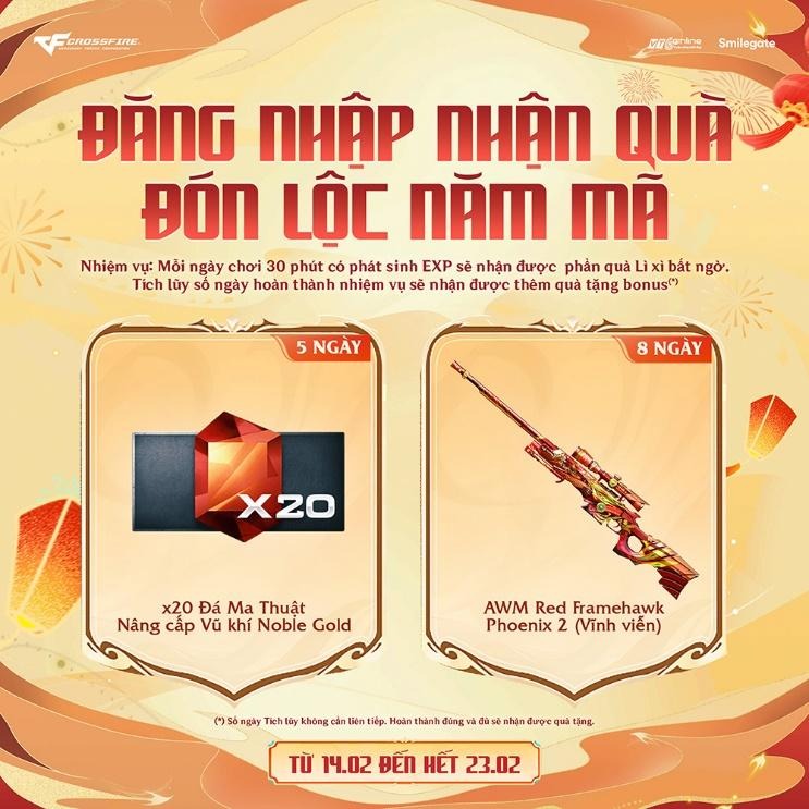 Trong thời gian nghỉ tết, từ 14/02 – 23/02, game thủ Crossfire chỉ cần đăng nhập và chiến game mỗi ngày là sẽ nhận được lì xì bất ngờ với loạt trang bị, vũ khí giá trị hoàn toàn miễn phí. Ngoài ra khi đăng nhập tích lũy đạt mốc, người chơi còn nhận thêm: