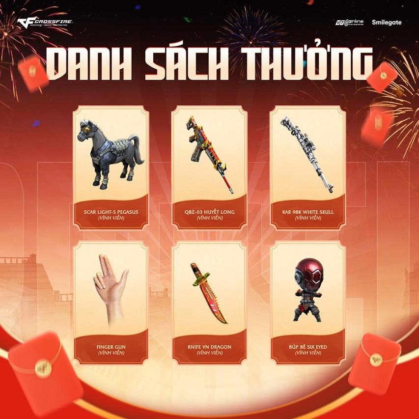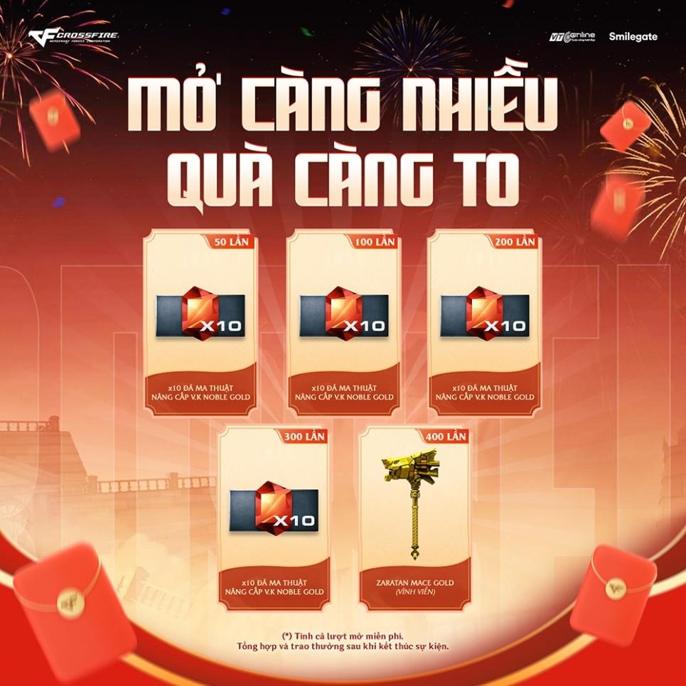 Chuỗi sự kiện mừng tết với nhiều cơ hội chi tiêu để nhận các bảo vật độc đáo như Kho Báu Hoàng Gia, QCMM, Lật Lì Xì,… Từ đó, Crossfire đã công bố thêm các hoạt động nhằm tối ưu lợi ích cho người chơi qua các phần thưởng theo mốc tiêu Go và đua top là một trong số đó. Từ 16/02 đến hết 28/02, người chơi đạt top tiêu Go nhận quà miễn phí đầy đặc quyền bao gồm:
