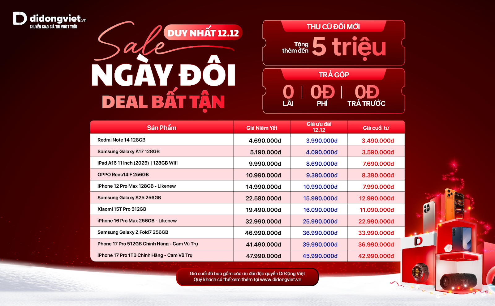 Bước vào giai đoạn nước rút cận Tết, nhu cầu nâng cấp thiết bị hoặc mua sắm quà tặng công nghệ có chiều hướng tăng mạnh. Hòa nhịp cùng làn sóng tiêu dùng cuối năm, hệ thống Di Động Việt sẽ diễn ra chương trình “Sale ngày đôi – Deal bất tận” vào ngày 12/12, tập trung vào các dòng sản phẩm công nghệ và gia dụng thông minh.