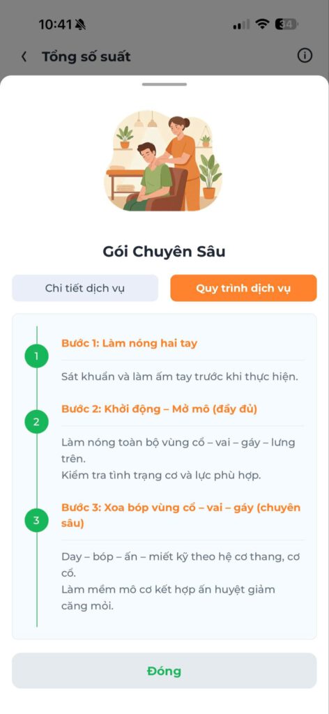 Dịch vụ được thực hiện bởi đội ngũ kỹ thuật viên có chứng chỉ hành nghề hợp lệ, được tuyển chọn, đào tạo và kiểm soát chất lượng theo quy trình chuẩn của bTaskee. Việc triển khai tại nơi làm việc giúp nhân viên được chăm sóc sức khỏe mà không làm gián đoạn hay ảnh hưởng đến hoạt động chung của công ty.