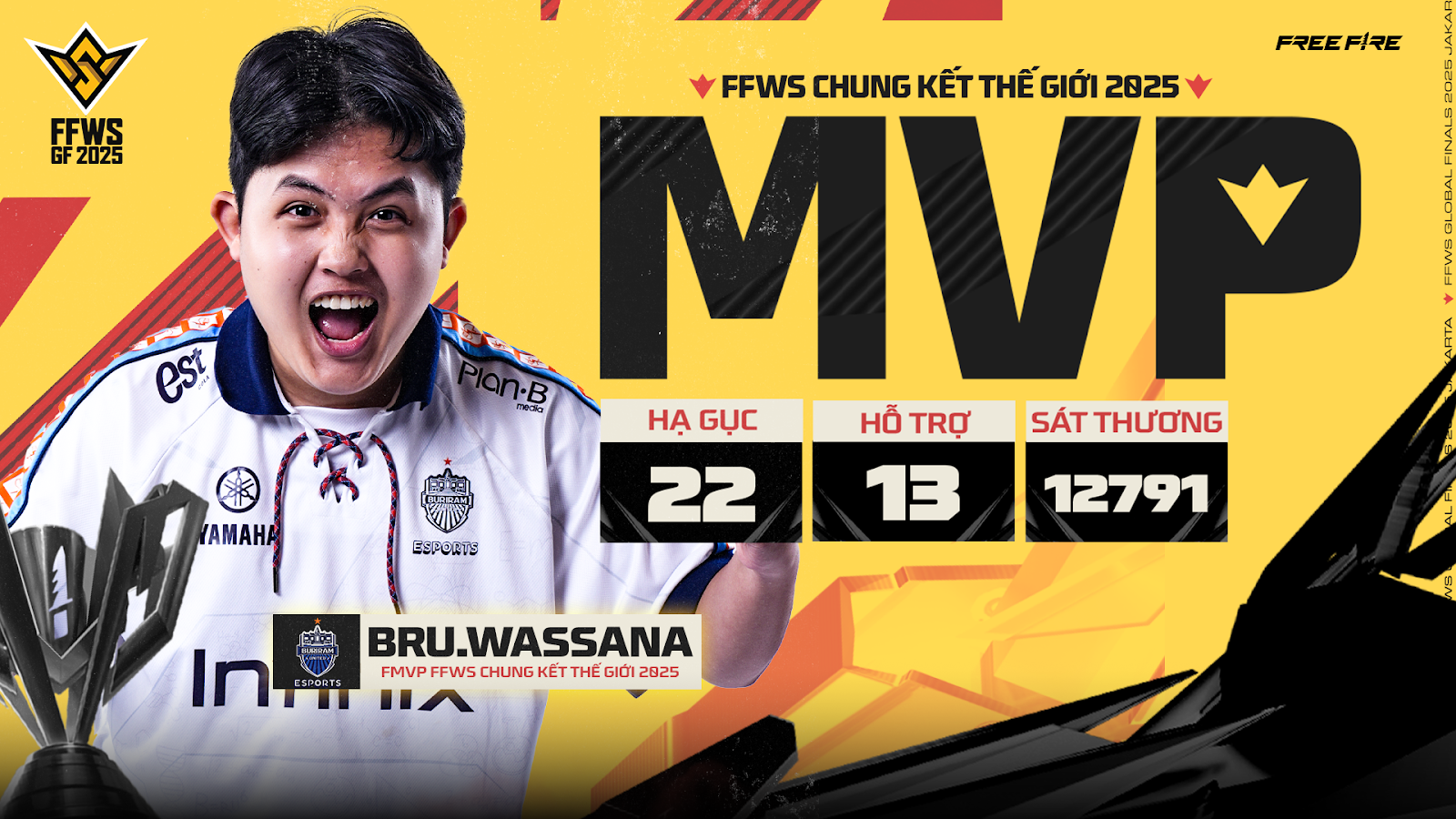 - Buriram United Esports đã chiến thắng áp đảo tại giải đấu Chung Kết Thế Giới Free Fire 2025, trong đó tuyển thủ Wassana giành cú đúp danh hiệu Tuyển Thủ Xuất Sắc nhất và Vua Hạ Gục của giải đấu.