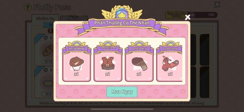 Tham gia Fluffy Pass, người chơi có cơ hội sở hữu set trang phục “Cao Bồi Đỏ” độc quyền, giúp các boss mèo khoác lên diện mạo mới lạ, khác biệt. Bên cạnh đó là combo quà tặng gồm Đá quý, Vàng, Nguyên liệu sản xuất và Nguyên liệu chế tạo đặc biệt.