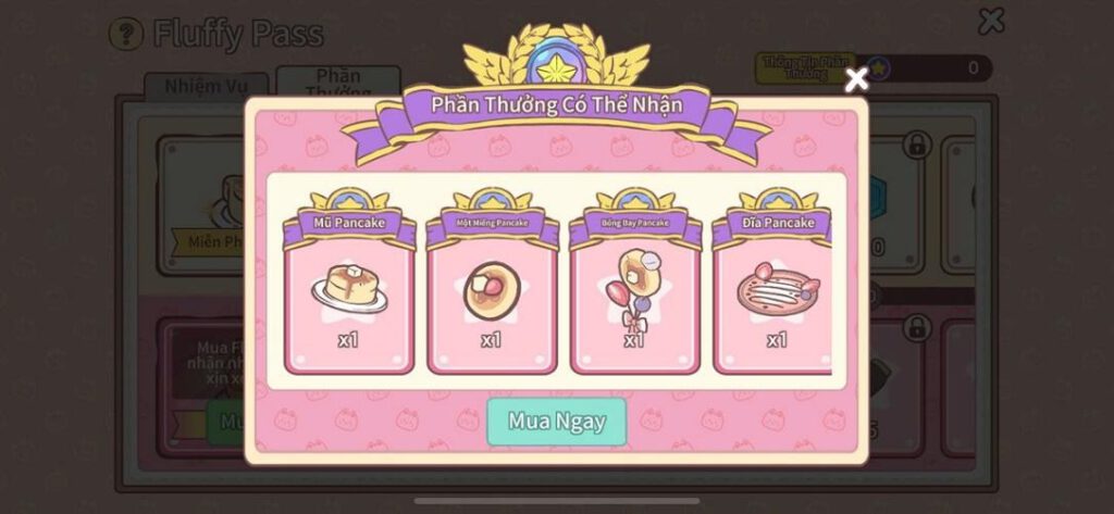 Tham gia Fluffy Pass, người chơi có cơ hội sở hữu nguyên set trang phục Pancake độc quyền, thêm vào tủ đồ cho các boss mèo một bộ trang phục mới. Bên cạnh đó là các phần quà quen thuộc nhưng thiết thực như Đá quý và Nguyên liệu sản xuất, hỗ trợ người chơi trong quá trình xây dựng và phát triển thị trấn.