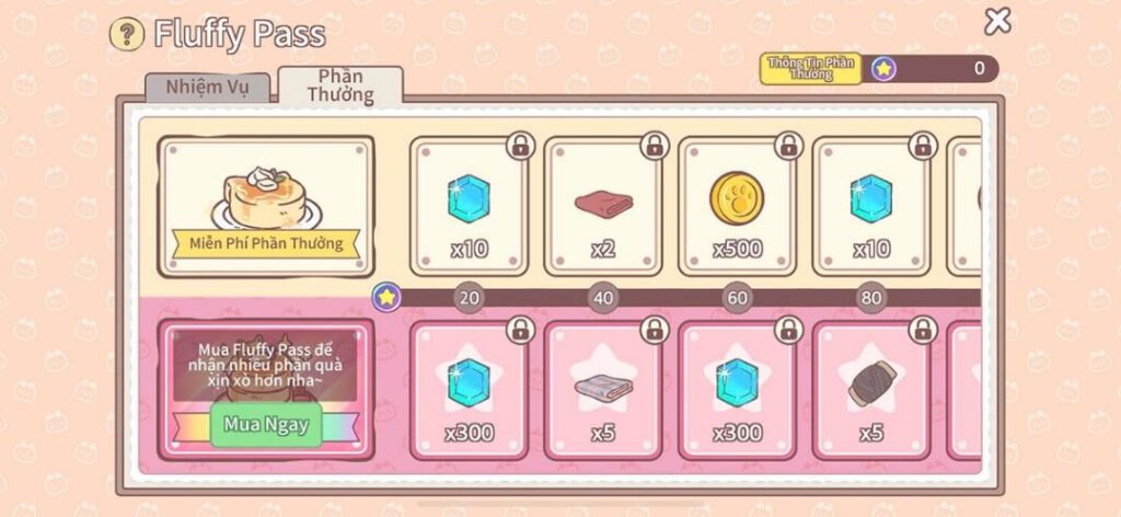 Fluffy Pass “Pancake Ngọt Ngào” tiếp tục giữ nguyên cơ chế hoạt động quen thuộc của các mùa trước. Người chơi chỉ cần hoàn thành nhiệm vụ sự kiện để tích lũy Điểm Sao, từ đó mở khóa và nhận các phần thưởng theo tiến trình, không áp lực cạnh tranh, phù hợp với lối chơi “chill” đặc trưng của Cats & Soup: Fluffy Town Việt Nam
