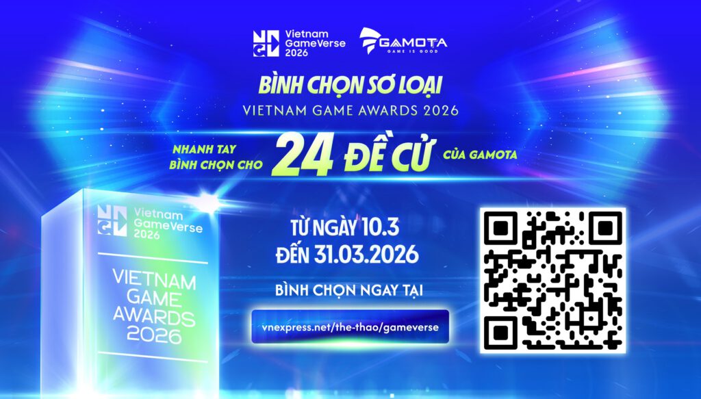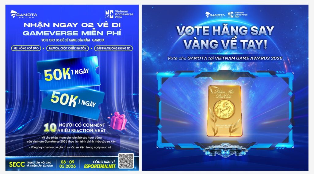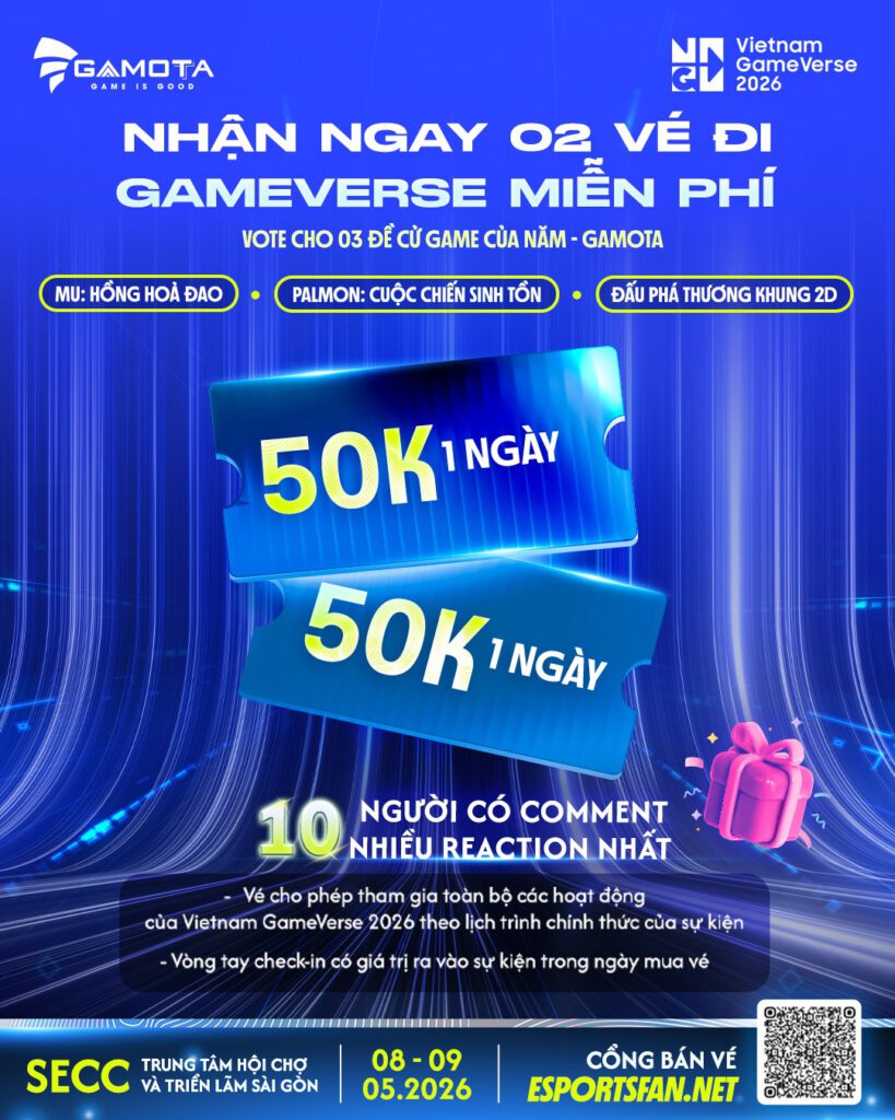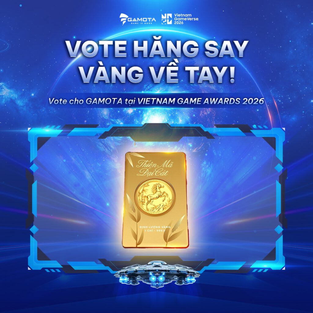 Để tri ân anh em đã “cày vote”, Gamota chơi lớn với chiến dịch “Vote hăng say – Vàng về liền tay”. Chỉ cần vài thao tác ủng hộ, bạn sẽ có cơ hội nhận ngay nửa chỉ vàng. Chưa hết, Gamota còn tặng vé tham dự Vietnam GameVerse 2026 miễn phí cho các fan cứng để anh em mình cùng “quẩy” tại SECC, TP.HCM vào ngày 8-9/5 tới.