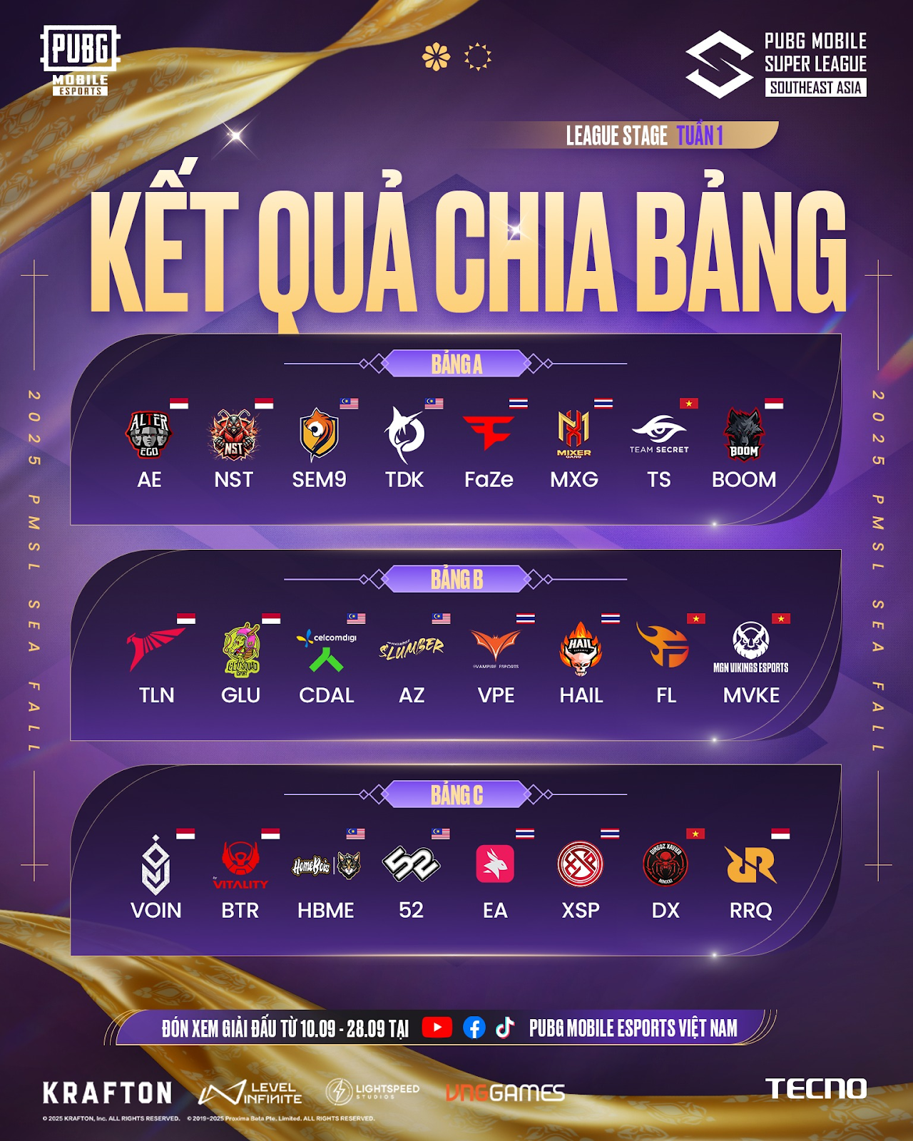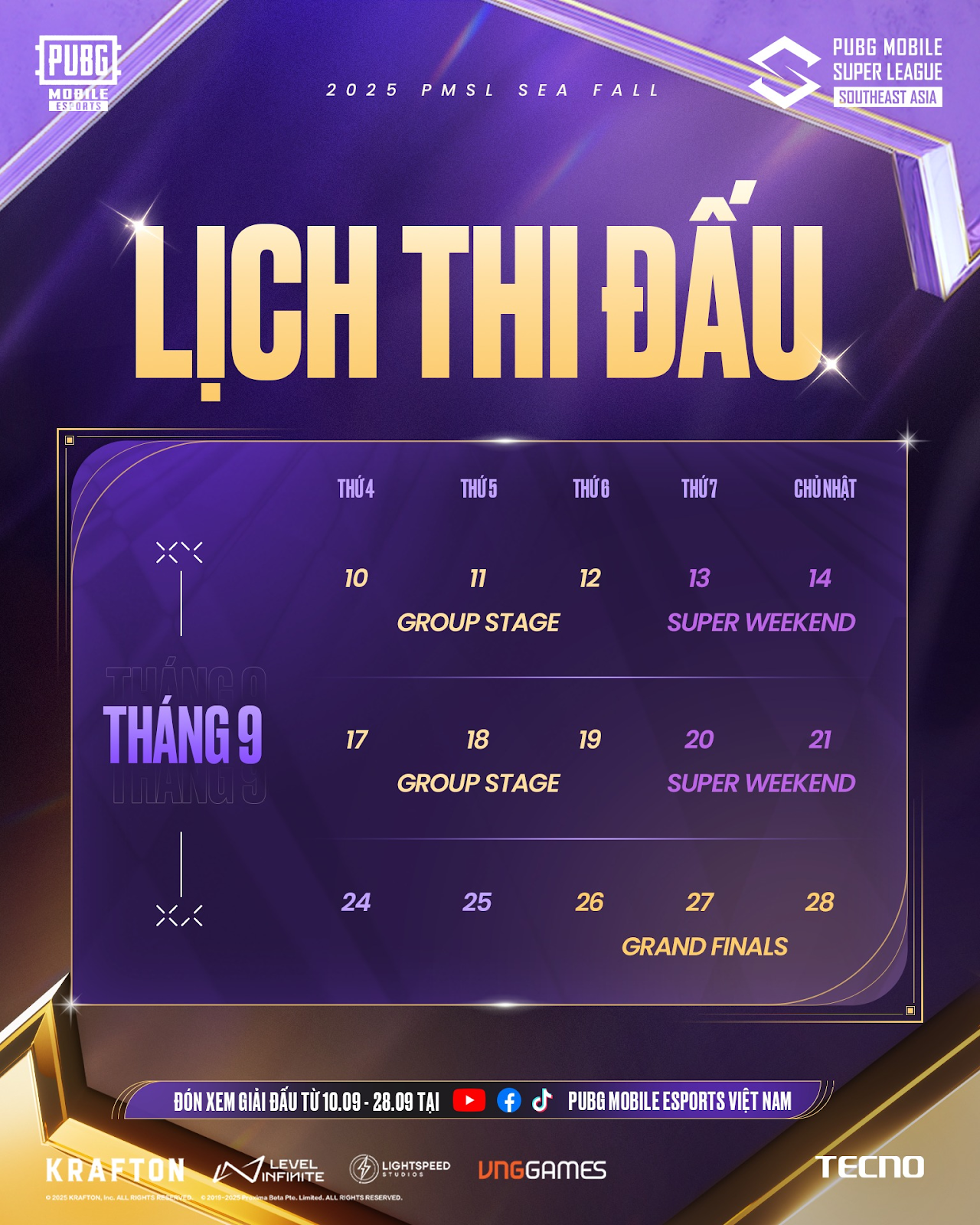Kể từ ngày 10.09 – 28.09.2025, các đại diện Thể thao điện tử của Việt Nam sẽ bước vào kỳ thi đấu Mùa Thu của giải đấu PUBG MOBILE hàng đầu khu vực Đông Nam Á với mục tiêu cao nhất là tranh suất tham dự giải Vô địch thế giới 2025 PMGC, cũng ngay tại Thái Lan.