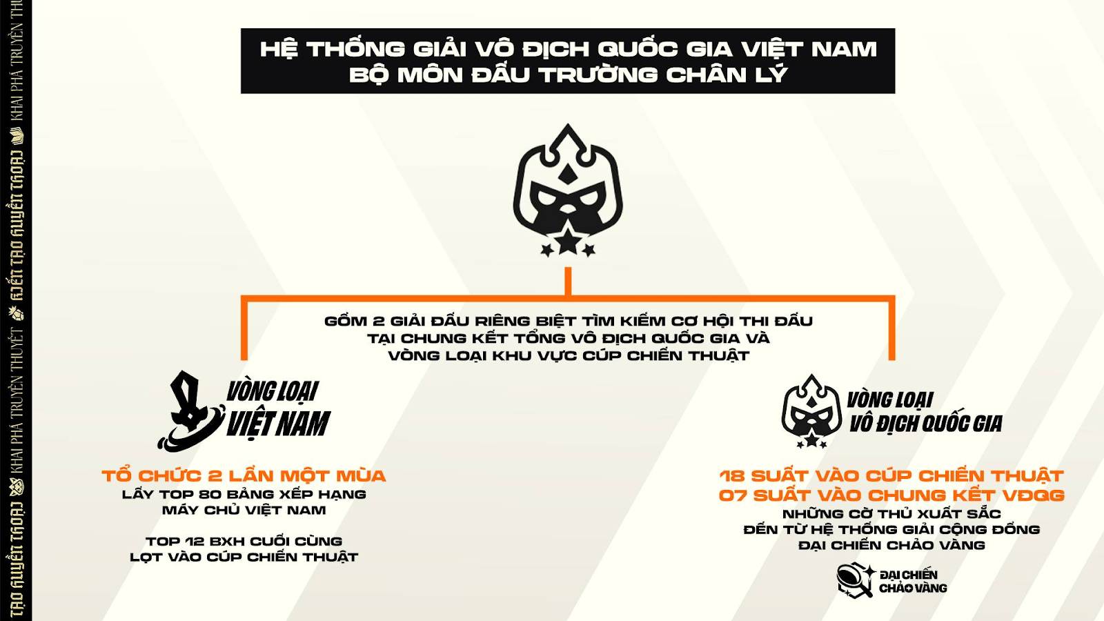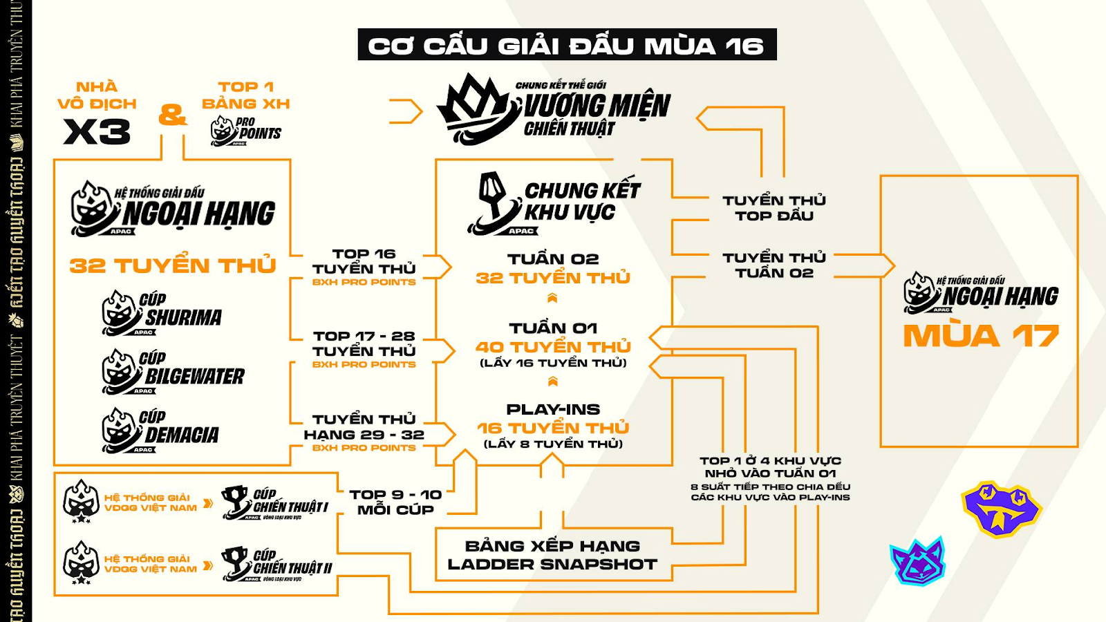 - Trong Mùa giải 16, giải Vô Địch Quốc Gia ĐTCL vẫn có 3 đợt tranh tài, bao gồm: Giai đoạn 1 – Giai đoạn 2 và Vòng Chung Kết Quốc gia. Các tuyển thủ tham dự giải đấu còn có thể cạnh tranh cơ hội đến với Cúp Chiến Thuật APAC.