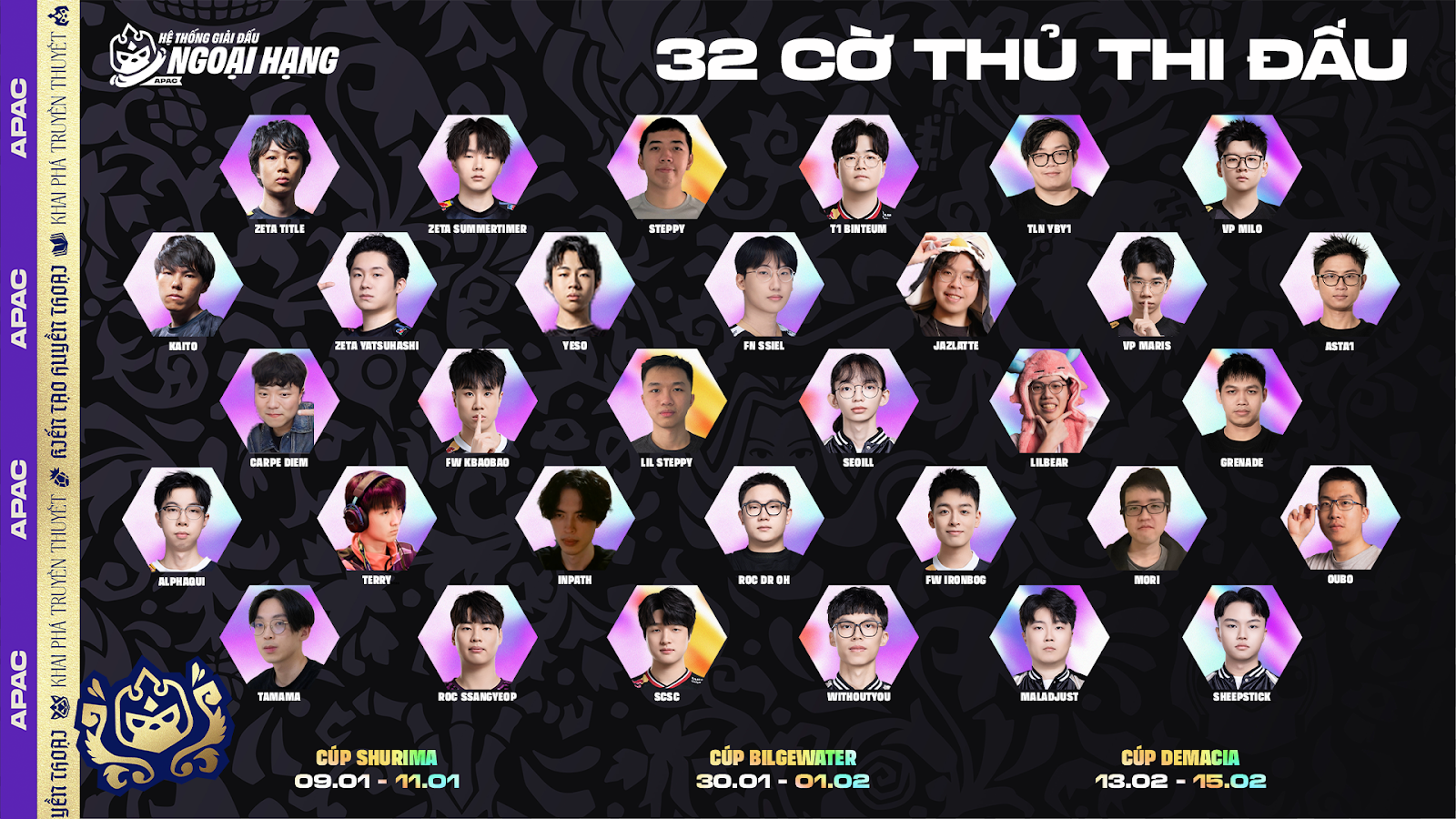 - Cúp Shurima sẽ là kỳ thi đấu mở màn cho Hệ thống giải đấu Ngoại hạng Mùa 16 khu vực APAC, diễn ra Online từ ngày 09.01 – 11.01.
