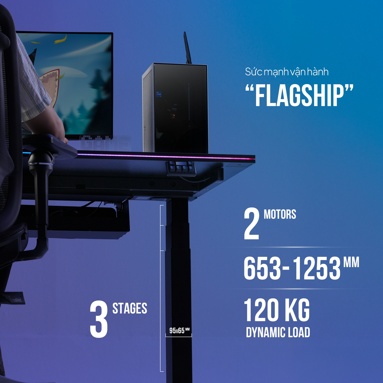 Đối với những người chơi hệ “full tower” hay sử dụng đa màn hình, Atlas Elite là lựa chọn không thể thay đổi. Với hệ thống 2 động cơ kép vận hành êm ái dưới 50dB, bàn sở hữu tải trọng động lên tới 120kg (và tải trọng tĩnh 300kg). Tốc độ nâng hạ ấn tượng 40mm/s giúp bạn thay đổi trạng thái từ ngồi sang đứng chỉ trong vòng 15 giây, đảm bảo nhịp độ giải trí không bao giờ bị gián đoạn.