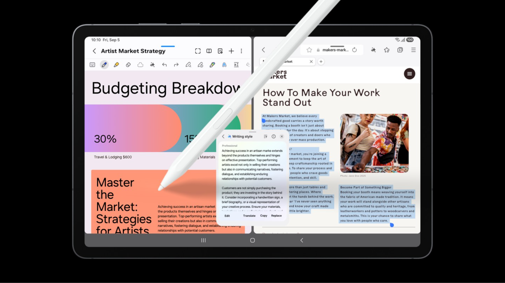 Bên cạnh Galaxy AI, Samsung DeX được nâng cấp trên Galaxy Tab S11 series giúp người dùng tối ưu năng suất khi đa nhiệm giữa nhiều ứng dụng, ghi chú trong cuộc họp hoặc phác thảo ý tưởng. Dù bạn là nhà thiết kế đang xây dựng ý tưởng hình ảnh hay khách du lịch thường xuyên lên kế hoạch cho chuyến đi trên nhiều ứng dụng và màn hình, Galaxy Tab S11 series đều hỗ trợ từng bước, từ nghiên cứu và phác thảo đến chia sẻ kết quả hoàn thiện.