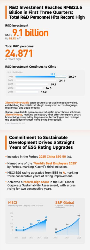 Xiaomi tiếp tục đẩy mạnh đầu tư R&D vào các công nghệ nền tảng. Chi phí R&D trong quý III đạt 1,28 tỷ USD, tăng 52,1% so với cùng kỳ năm trước và lập kỷ lục mới. Tổng chi phí R&D trong 3 quý đầu năm đạt 3,31 tỷ USD và dự kiến tổng đầu tư R&D trong 2025 sẽ vượt 4.22 tỷ USD. Tính đến ngày 30/9/2025, tổng số nhân sự R&D của Xiaomi là 24.871 người, mức cao nhất từ trước đến nay.