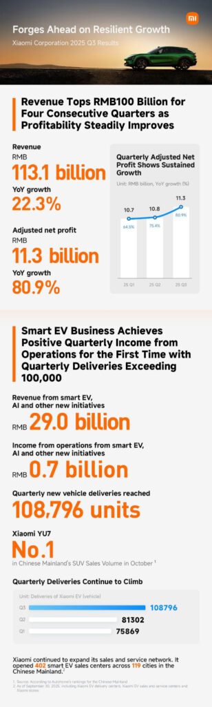 Trong quý III, Xiaomi đã bàn giao hơn 100.000 xe điện thông minh với số lượng kỷ lục 108.796 chiếc, nâng tổng số bàn giao trong ba quý đầu năm lên hơn 260.000 chiếc. Tính đến ngày 30/9/2025, Tập đoàn sở hữu 402 trung tâm bán hàng và dịch vụ xe điện thông minh tại 119 thành phố ở Trung Quốc.