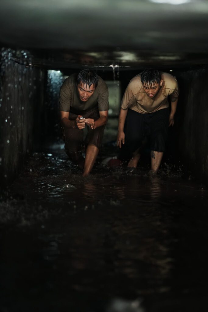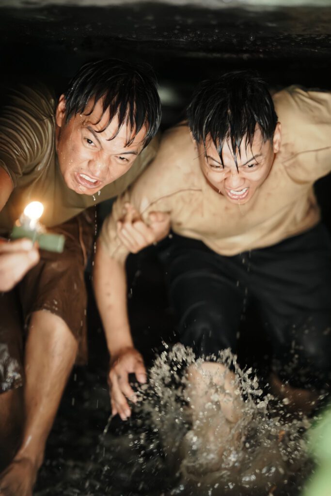 Trong phân cảnh này, Quang Tuấn và Hoài Lâm mất nhiều giờ đồng hồ quay phim dưới một đoạn cống ngầm, phía dưới là dòng nước đen thui còn ở trên, mỗi khi đạo diễn hô diễn là nước được bơm xối xả. Ngoài ra, tổ thiết kế còn chuẩn bị rất nhiều các “diễn viên quần chúng không lương” là những chú chuột.