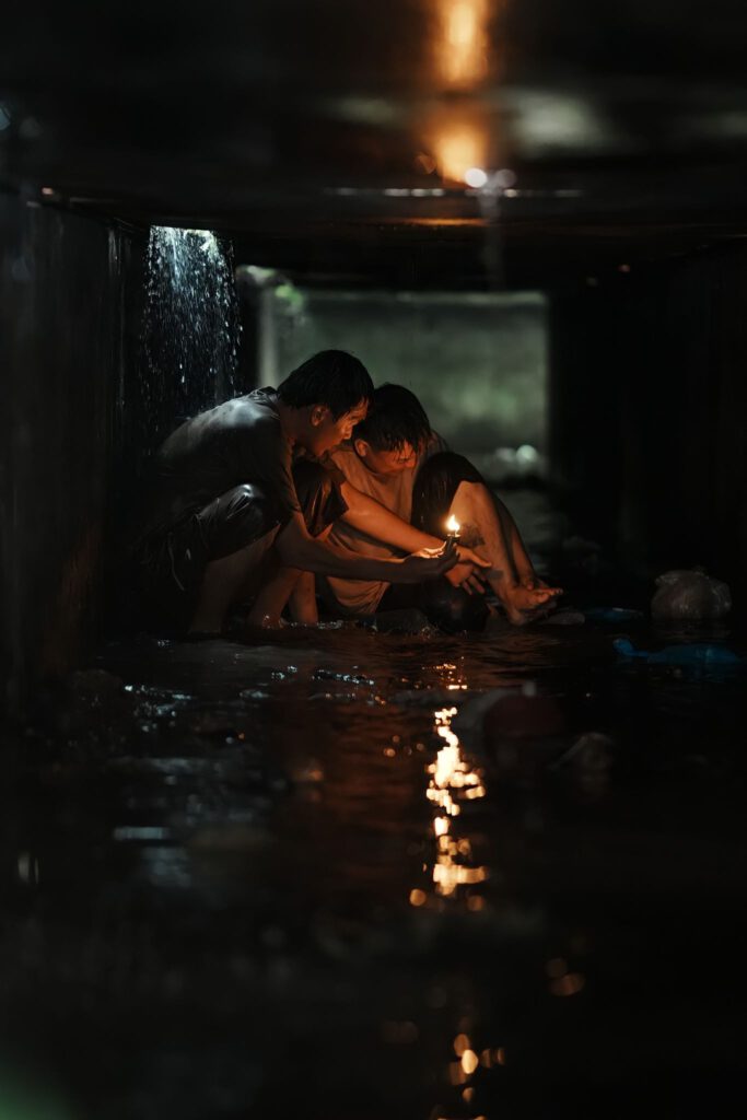 Trên khắp cơ thể họ là những vết thương chi chít. Họ lấm lem, ướt sũng với ánh mắt vừa dò xét vừa đầy sợ hãi. Điểm nhấn trong tay họ là một ngọn lửa nhỏ được thắp lên yếu ớt nhưng không vụt tắt, trở thành điểm sáng duy nhất giữa bóng tối. Chi tiết đó khắc họa rõ hành trình sinh tồn nơi đáy cùng của tuyệt vọng nhưng vẫn còn chút hy vọng le lói giữa địa ngục trần gian.