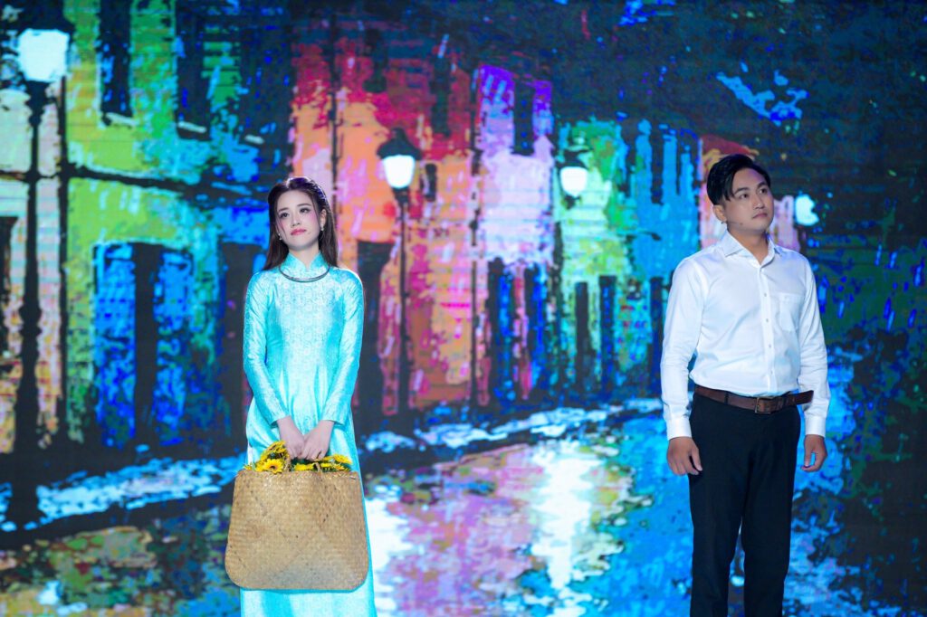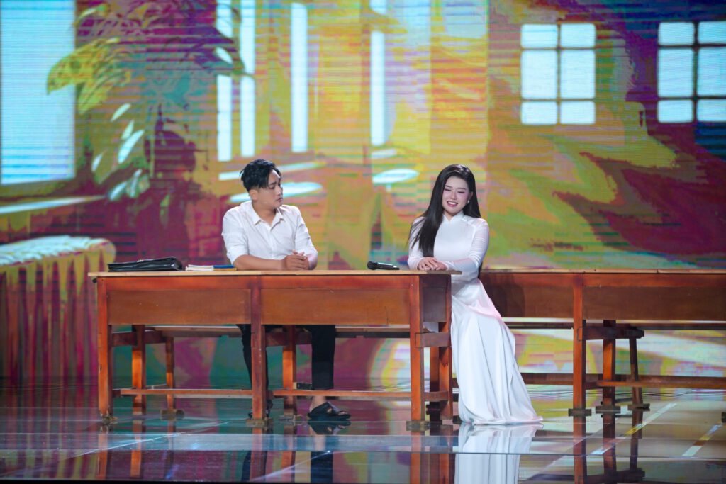 Khép lại đêm thi, Mai Diễm My bước ra sân khấu trong tà áo dài xanh ngọc thướt tha, gợi lên dáng vẻ “liễu yếu đào tơ” vừa e ấp vừa duyên dáng. Với chất giọng ngọt như mật và cách kể chuyện mềm mại, nữ ca sĩ như khẽ “vuốt ve đôi tai” khán giả qua từng câu hát của Thuở ban đầu, để lại dư âm thanh thoát và đầy cảm xúc.