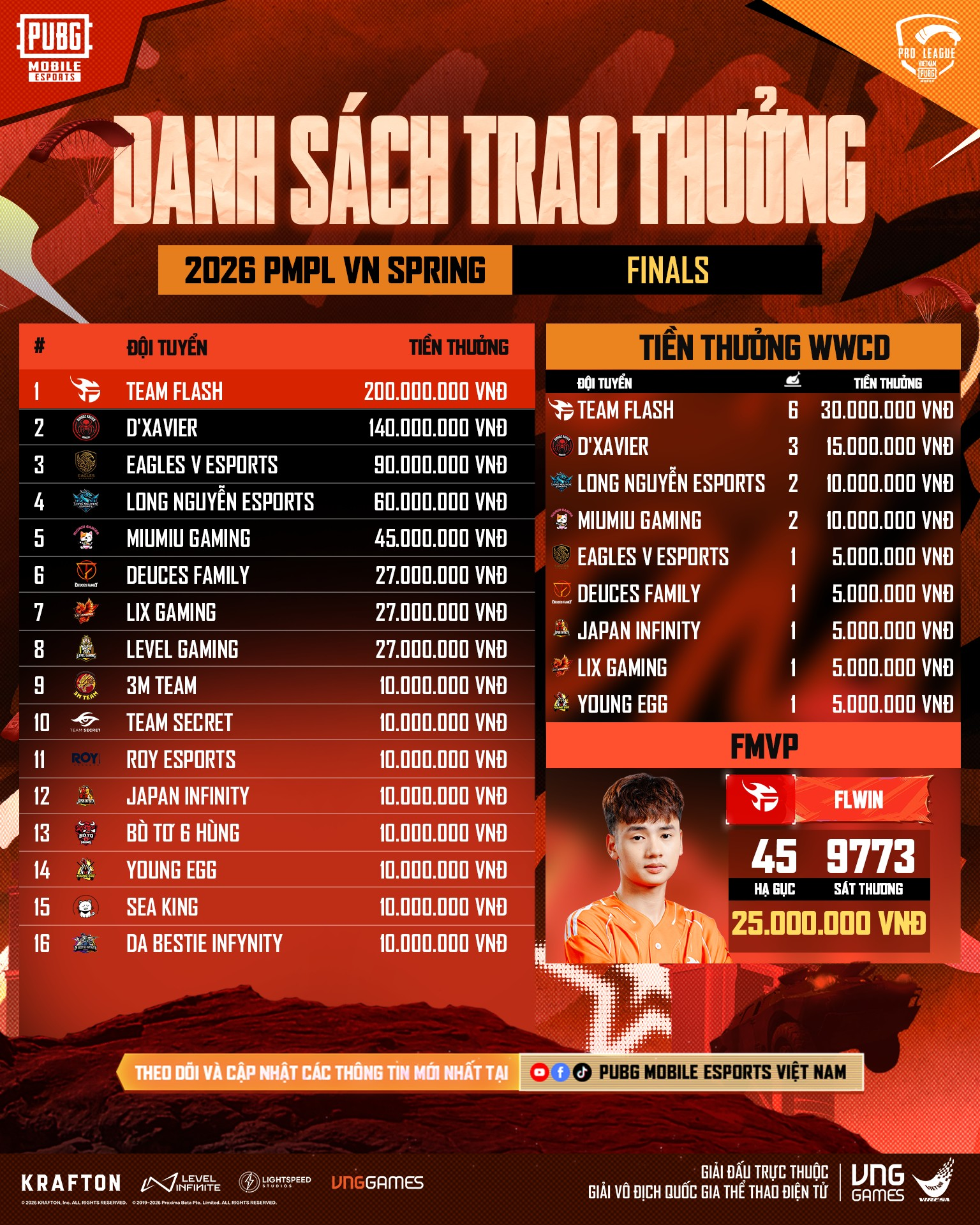 Những cái tên như Bowz, Zhius, Topz, Hà Dè và đặc biệt là Win đã nối dài chuỗi thống trị của họ tại các giải quốc nội. Với kết quả này, Team Flash cùng Á quân D’Xavier sẽ là hai đại diện của Việt Nam tiến thẳng đến 2026 PMGO SEA Finals Season 1.