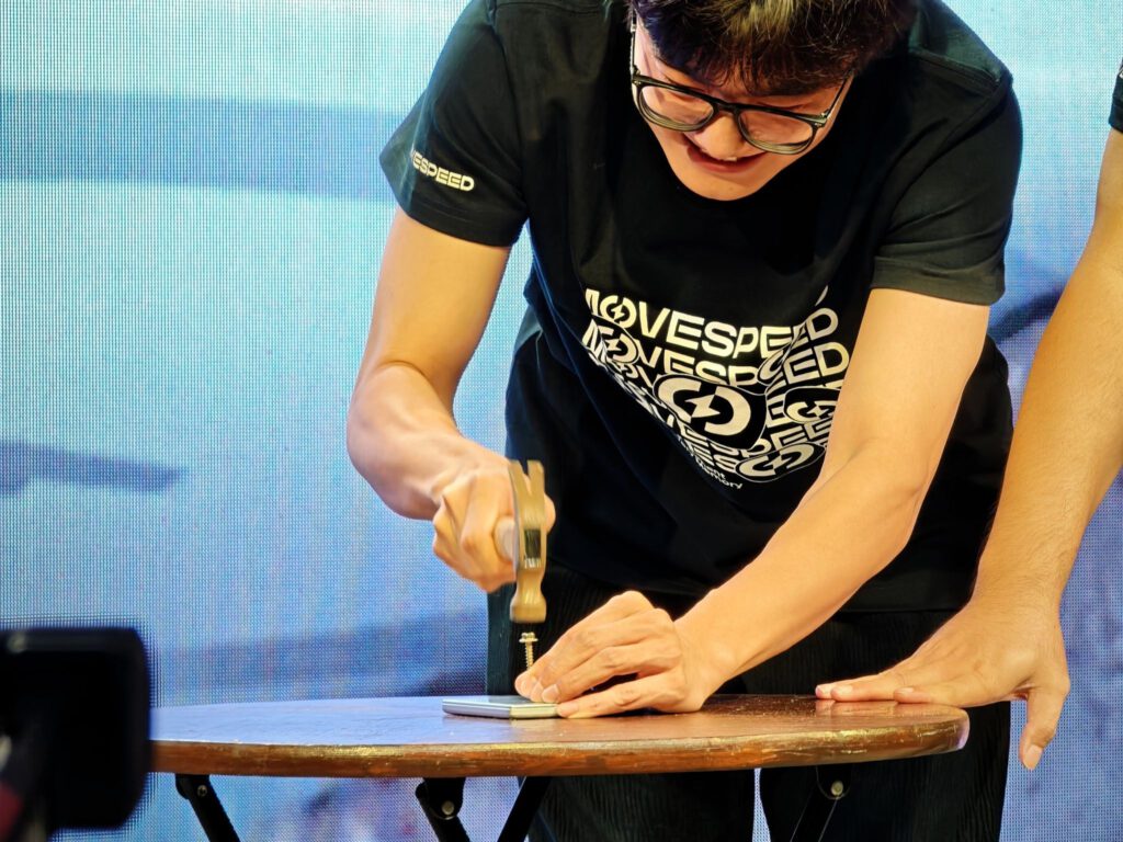 Tâm điểm của buổi lễ khiến toàn bộ khán phòng ấn tượng mạnh mẽ chính là màn trình diễn thực tế (live demo) kiểm chứng chất lượng an toàn của sản phẩm. Ngay trên sân khấu, chuyên gia kỹ thuật đến từ Movespeed đã thực hiện thử nghiệm đâm xuyên sạc dự phòng bằng vật kim loại nhọn. Kết quả cho thấy, dù chịu tác động vật lý phá hủy nghiêm trọng, viên pin Movespeed vẫn giữ trạng thái ổn định, không hề xảy ra hiện tượng cháy nổ hay bốc khói.