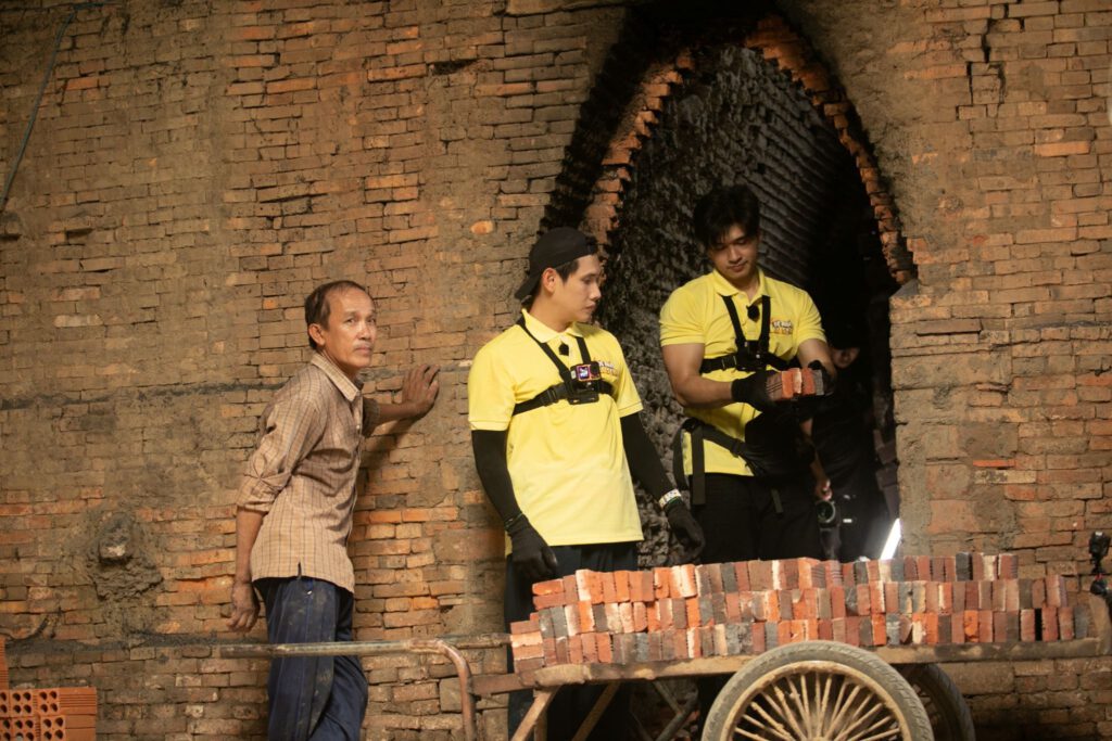 Công việc làm gạch đòi hỏi sức khoẻ, sự khéo léo và nhịp phối hợp liên tục ở mọi công đoạn: lấy đất nguyên liệu, tạo hình, vận chuyển, xếp gạch, dỡ gạch ra khỏi lò. Kể cả khâu tưởng nhẹ nhàng nhất là bắt gạch từ dây chuyền cũng không hề đơn giản. Vĩnh Thích Ăn Ngon vốn rất tự tin vào sự khéo léo của mình nhưng vẫn luống cuống bắt không kip, để gạch rơi trong hoảng loạn.