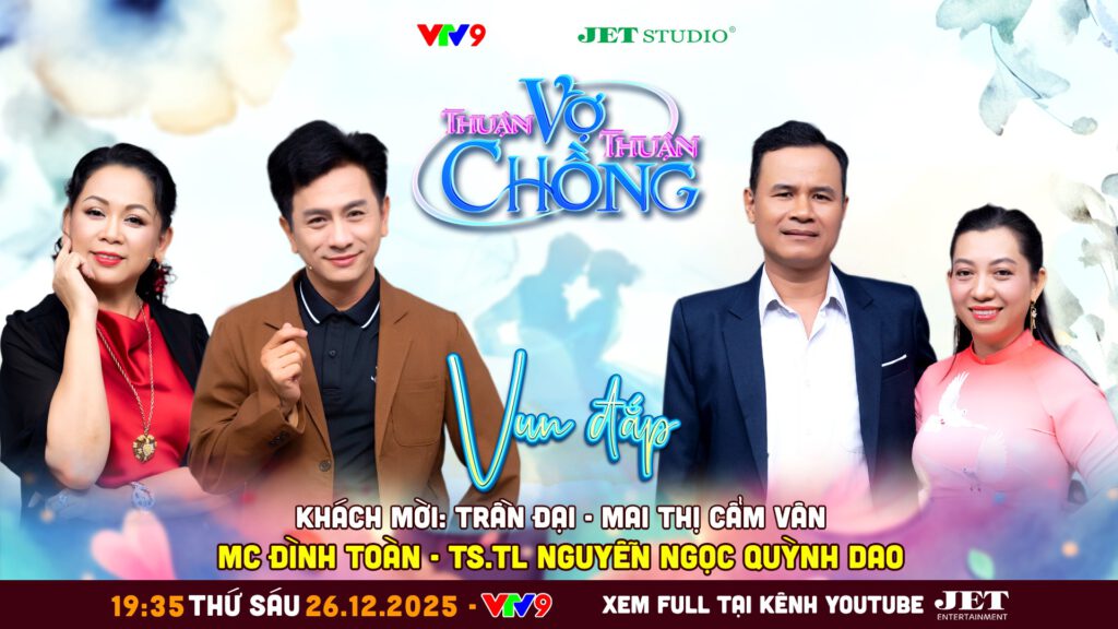 Thuận Vợ Thuận Chồng với câu chuyện “Vun đắp” của đôi vợ chồng Trần Đại – Mai Thị Cẩm Vân sẽ phát sóng lúc 19:35, thứ Sáu ngày 26/12/2025 trên kênh VTV9. Chương trình do VTV9 phối hợp cùng Jet Studio thực hiện.