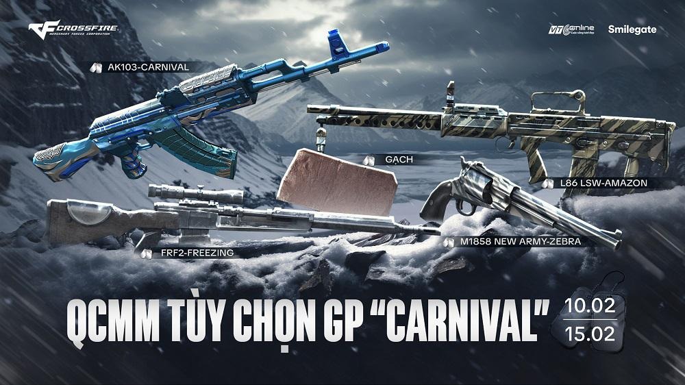 Tiếp nối chuỗi sự kiện là QCMM Tùy Chọn GP Carnival, lấy cảm hứng từ những lễ hội Carnival rực rỡ trên thế giới. Sự kiện mang đến loạt vũ khí sở hữu phong cách thiết kế trẻ trung, nổi bật với các họa tiết màu sắc độc đáo, tạo nên diện mạo mới đầy cá tính cho nhiều dòng trang bị quen thuộc.