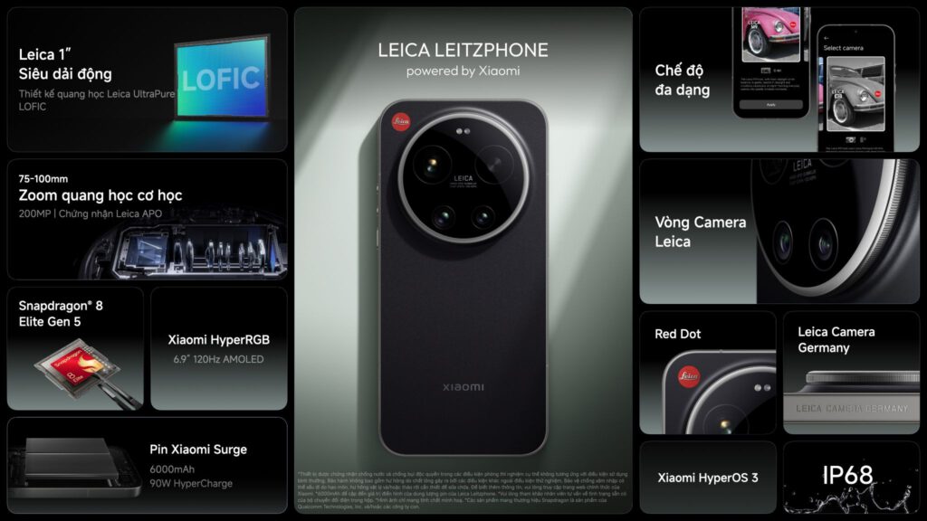 Điểm nhấn nổi bật của LEICA LEITZPHONE powered by Xiaomi nằm ở Leica Camera Ring, vòng điều khiển vật lý tích hợp quanh cụm camera, cho phép người dùng xoay để kích hoạt nhanh camera hoặc điều chỉnh các thông số như EV, tốc độ màn trập và hiệu ứng hình ảnh một cách trực quan. Thiết bị còn tích hợp chế độ Leica Essential với hai phong cách Leica M3 và Leica M9 được tái tạo dựa trên dữ liệu hình ảnh thực tế, mô phỏng đặc tính tương phản, sắc độ và chất ảnh đặc trưng của Leica. Phiên bản đặc biệt này là sự hội tụ giữa tinh hoa Leica và nền tảng công nghệ flagship của Xiaomi, mang đến một trải nghiệm nhiếp ảnh mang tính biểu tượng trong kỷ nguyên smartphone.